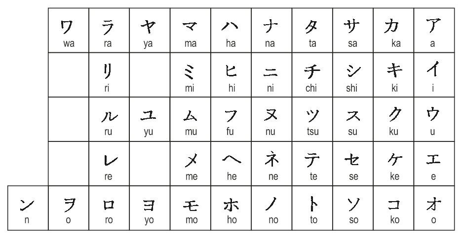 KATAKANA 片仮名 digunakan untuk menulis kata-kata dalam bahasa asing, seperti nama negara (アメリカ Amerika), nama orang asing (アントニー Anthony), dan kata-kata serapan dari bahasa asing (テーブル teeburu ‘table’)